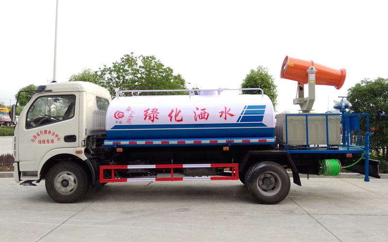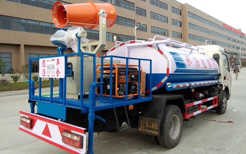 整車具有前沖、后灑、側(cè)噴、后置式工作平臺(帶踏梯,四周有安全護(hù)欄)、平臺上設(shè)置有高壓水炮(可360°全方位旋轉(zhuǎn),可連續(xù)噴射出:直沖狀、開花狀、雨狀、半霧狀等水流形態(tài)。柱狀水流射程28米,半霧狀射程14米)。平臺上安裝帶獨立動力的炮筒式風(fēng)送噴霧打藥機組。該車灑水寬度大于14米,配備優(yōu)質(zhì)大功率專用灑水泵、取力器、雜物過濾網(wǎng)、國標(biāo)通用65型消防接口(可通過消防栓加水)、1套自流球閥系統(tǒng)(可自吸自排,大吸程6米)、2根引水鋼絲膠管(帶陰陽快速接頭)、配鎖、水位計、高音作業(yè)喇叭,兩側(cè)及后加強型保險杠,防滑爬梯,膠管儲存筒。